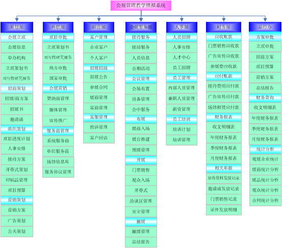 思沃會(hui)(hui)(hui)展(zhan)營銷(xiao)模(mo)擬實(shi)(shi)訓系(xi)統以(yi)模(mo)擬會(hui)(hui)(hui)展(zhan)公司的(de)(de)(de)(de)策劃部(bu)、外聯部(bu)、招(zhao)(zhao)商部(bu)、會(hui)(hui)(hui)展(zhan)服務(wu)(wu)部(bu)、人(ren)事(shi)部(bu)、財務(wu)(wu)部(bu)以(yi)及(ji)總(zong)(zong)經辦7大業(ye)務(wu)(wu)部(bu)門為基(ji)礎(chu)而(er)展(zhan)開實(shi)(shi)驗操(cao)作(zuo)(zuo)的(de)(de)(de)(de)。該教學(xue)平臺軟件業(ye)務(wu)(wu)內容包括了:項目(mu)上報審批(pi)、項目(mu)的(de)(de)(de)(de)策劃安(an)排、服務(wu)(wu)商管理、人(ren)事(shi)招(zhao)(zhao)聘與管理、會(hui)(hui)(hui)展(zhan)的(de)(de)(de)(de)現場服務(wu)(wu)與合(he)同管理等(deng)等(deng),讓(rang)學(xue)生(sheng)通(tong)過(guo)實(shi)(shi)驗感受會(hui)(hui)(hui)展(zhan)項目(mu)的(de)(de)(de)(de)系(xi)統化管理流程與業(ye)務(wu)(wu)操(cao)作(zuo)(zuo)內容,不但能夠了解會(hui)(hui)(hui)展(zhan)項目(mu)從立項審批(pi)到策劃、宣傳、招(zhao)(zhao)展(zhan)招(zhao)(zhao)商、現場服務(wu)(wu)以(yi)及(ji)會(hui)(hui)(hui)后(hou)總(zong)(zong)結各(ge)個環節的(de)(de)(de)(de)業(ye)務(wu)(wu),同時還可以(yi)掌握(wo)各(ge)種文案的(de)(de)(de)(de)寫作(zuo)(zuo)技巧,從而(er)讓(rang)學(xue)生(sheng)真(zhen)正的(de)(de)(de)(de)理解并掌握(wo)會(hui)(hui)(hui)展(zhan)這一(yi)行業(ye)的(de)(de)(de)(de)各(ge)種知識與業(ye)務(wu)(wu)要求。為學(xue)生(sheng)以(yi)后(hou)的(de)(de)(de)(de)工作(zuo)(zuo)、學(xue)習提供了一(yi)個實(shi)(shi)戰演練的(de)(de)(de)(de)實(shi)(shi)訓平臺,增(zeng)強了學(xue)生(sheng)進入(ru)工作(zuo)(zuo)崗位(wei)后(hou)的(de)(de)(de)(de)實(shi)(shi)力(li)。