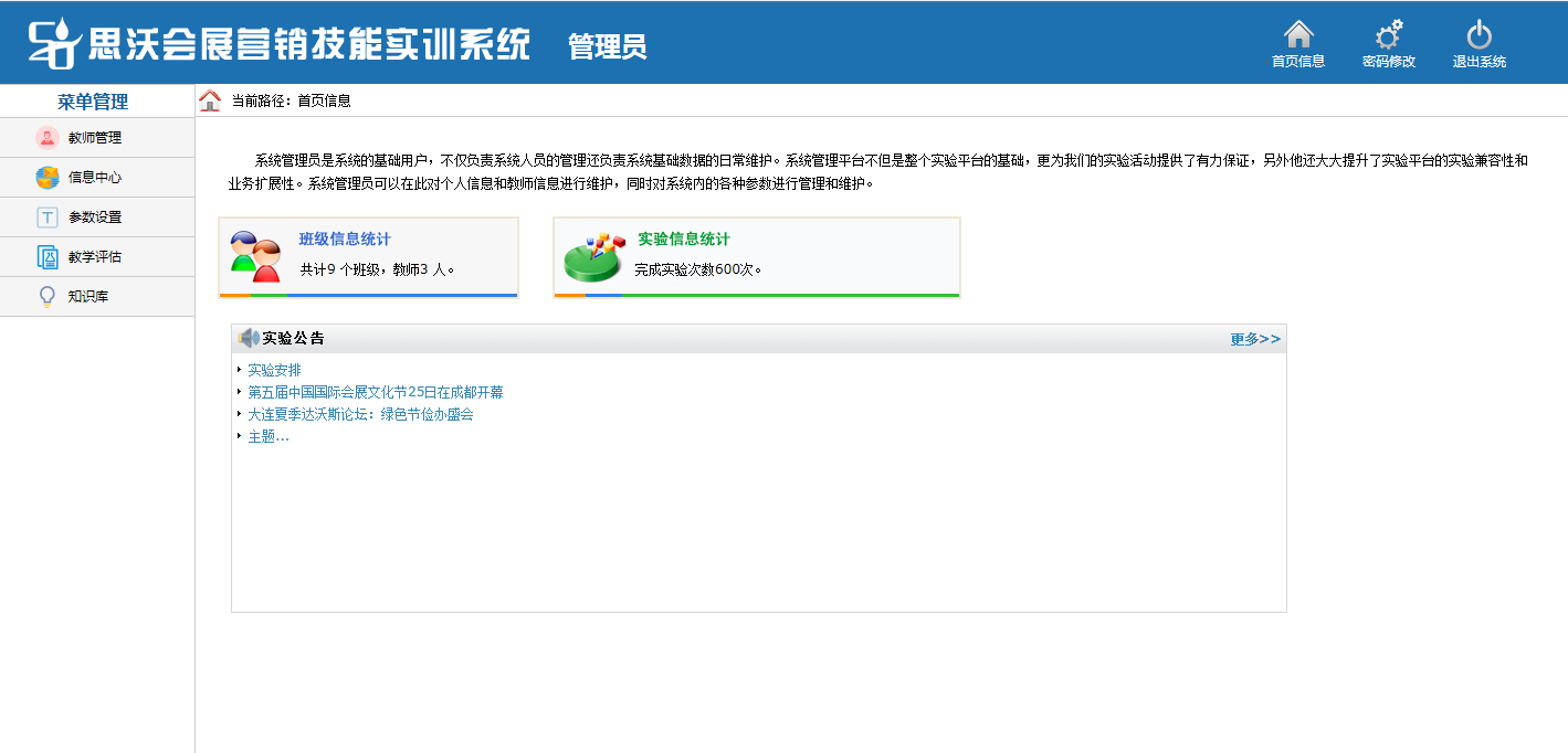 管(guan)理員包含(教室管(guan)理,信息中心,參數設置,教學評估,知識庫等模塊)