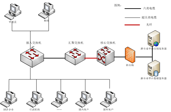 整(zheng)個網(wang)絡設(she)計以千(qian)(qian)兆(zhao)(zhao)為主干,百兆(zhao)(zhao)到桌面的結(jie)構(gou),匯聚層交換(huan)機(ji)通過(guo)千(qian)(qian)兆(zhao)(zhao)光纖連接到核心(xin)交換(huan)機(ji),再(zai)通過(guo)千(qian)(qian)兆(zhao)(zhao)電纜連接到接入層交換(huan)機(ji),這樣的設(she)計結(jie)構(gou)具有層次化設(she)計節約(yue)線路成本、保障(zhang)安全、便(bian)于管理、擴(kuo)展(zhan)靈活等特點。