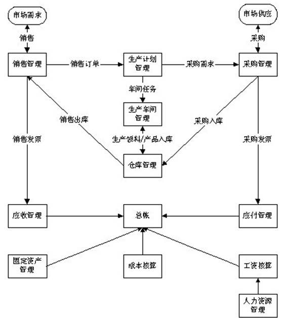 制(zhi)造企(qi)(qi)業(ye)(ye)(ye)內部運作(zuo)是(shi)以銷售、生(sheng)產、采購、財務待為主的(de)(de)(de)(de)經(jing)營模式(shi),采用(yong)制(zhi)造企(qi)(qi)業(ye)(ye)(ye)ERP管(guan)理(li)(li)理(li)(li)念,企(qi)(qi)業(ye)(ye)(ye)的(de)(de)(de)(de)物流(liu)、資(zi)金流(liu)、和信息(xi)流(liu)統一起來(lai)進(jin)行管(guan)理(li)(li),對(dui)企(qi)(qi)業(ye)(ye)(ye)所擁(yong)有(you)(you)的(de)(de)(de)(de)人(ren)力、資(zi)金、材料、設備、方法(生(sheng)產技術)、信息(xi)和時間等各項資(zi)源進(jin)行綜合平衡和充分考慮,最大(da)限度的(de)(de)(de)(de)利用(yong)企(qi)(qi)業(ye)(ye)(ye)的(de)(de)(de)(de)現(xian)有(you)(you)資(zi)源取得最大(da)的(de)(de)(de)(de)經(jing)濟(ji)效(xiao)益,科學、有(you)(you)效(xiao)的(de)(de)(de)(de)管(guan)理(li)(li)企(qi)(qi)業(ye)(ye)(ye)人(ren)、財、物、產、供、銷等各項具體業(ye)(ye)(ye)務工作(zuo)。包含如MRP、MTO、MTP、JIT等的(de)(de)(de)(de)應用(yong)。如下流(liu)程: